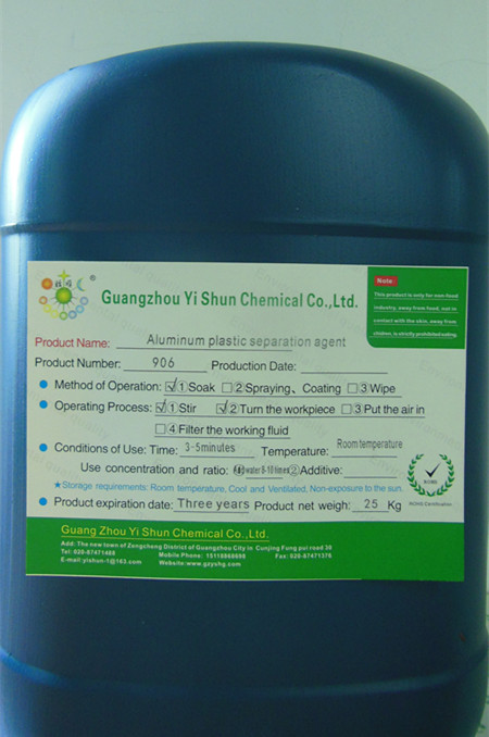 Aluminum-Plastic Separation agent,Aluminum-Plastic Isolation liquid,Chemical Separation liquid Aluminum-Plastic Separation agent,Aluminum-Plastic Isolation liquid,Chemical Separation liquid First, product number:Q/YS.906( Yi Shun brand) Second, range of application: This product is suitable for aluminum coating removal of glass and plastic surface , it is corrosive to plastic and glass basis,it can remove aluminum quickly and clearly. Third, usage method: The original liquid is coating on the surface of glass or plastic aluminum, for a few seconds remove coating, also can remove aluminum with the way of soaking, add water 8-10 times and soak for 3-5 minutes, rinse it clean with water when you finish the removal. Fourth, technical parameter: Acid transparent liquid. Fifth, matters needing attention: Acidic liquid, no irritating smell, please wear rubber gloves in operation, if you are careless to touch it, please immediately rinse with water. Do not splash during operation. Other processing:Multifunctional disinfection detergent、Ink Cleaning Agent、Gold and silver jewelry bright cleaning agent、Metal cleaning agent、Environmental degreer and rust remover、Stainless Steel Polishing Agentas、Coating type soft glue removal cream