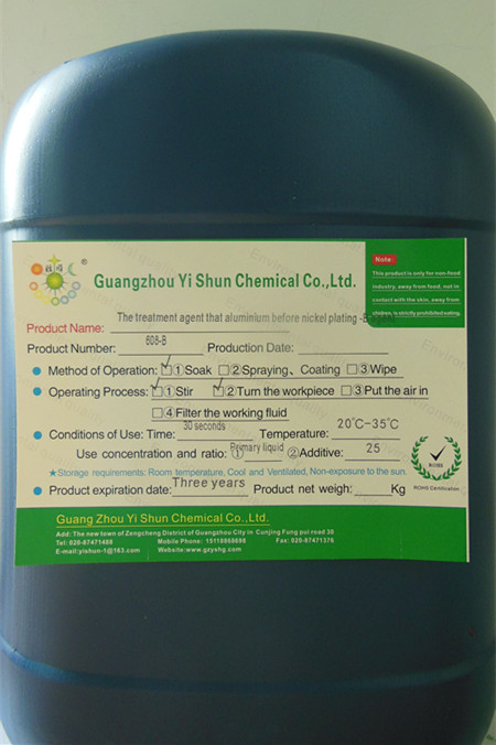 Pre-treatment agent for chemical nickel plating on aluminum material,Metal surface pretreatment agent, Metal surface pretreatment fluid,Aluminum pretreatment agent First, the product code: Q / YS.608 (Yi Shun brand) Second, the scope of products: This product is used for the treatment of aluminum before nickel plating, so that the surface of the aluminum material is formed with a dense chemical plating in order to improve the adhesion of the nickel plating in the next step. Third, product index: ① Appearance: light blue liquid, odorless ② Proportion: 1.20 ± 0.05 ③ PH value:> 5.0 Fourth, the product operation method: ① After the degreasing and degreasing of aluminum, soak in the stock solution of agent A (Q / YS.608) A for about 8-30 seconds, take out the aluminum workpiece and wash it with water. ② Then put the workpiece before processing agent B solution soak for about 30 seconds and then washed. ③ The workpiece is again immersed in nickel plating agent A agent, about 8 seconds and then remove the workpiece, immediately washed. ④ Washed aluminum clean, you can enter the chemical nickel plating nickel. ⑤ Temperature: 20-35 ℃. Fifth, note: ① Aluminum degreasing, degreasing or polishing before entering the pre-treatment solution (Q / YS.608). ② Pre-soaking time to control, so as not to affect the binding power. ③ Pre-treatment should be promptly washed, and timely plating chemical plating. ④ Products are corrosive, be careful not to contact with the skin. Other processing:Chemical Plating Liquid Train、Chemical nickel plating liquid、Aluminum surface treatment agent series、Metal cleaning agent、Nickel removal liquid、Stainless steel remover for removing oil and rust