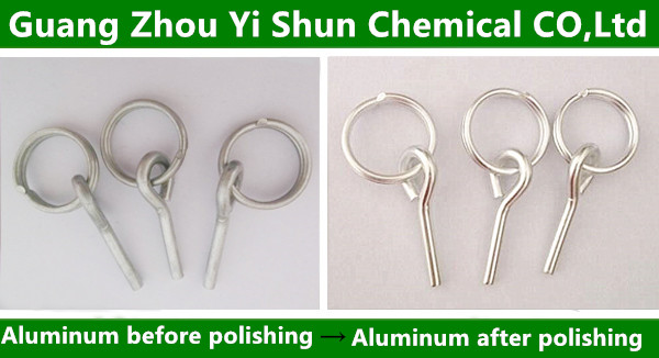 Aluminum chemical deburring polishing agent (acidic),Aluminum alloy polishing agent,Brightener for aluminum Aluminum chemical deburring polishing agent (acidic),Aluminum alloy polishing agent,Brightener for aluminum 1.Product number: Q/YS.204-2 (Yi Shun brand) 2.Product features: This product is suitable for chemical polishing of pure aluminum and aluminum alloy (except die casting aluminum), also can rapidly improve the gloss up to a mirror bright. Product also has the function of removing burr. 3.Product index: Proportion: 1.2-1.22 4.Operation process: ⑴ To prepare stainless steel material or a thick plastic container, aluminum polishing agent measured is immersed in polishing vessel. Fully stir evenly with plastic bar tools. At this time the polishing liquid will be heated up to 80℃~100℃ with stainless steel tube. ⑵The oil – free and ink-free aluminum work piece is immersed gently in the polishing solution of 80 ℃ to 100 ℃ with operation tool (clamp, hook and so on), gently flip the work piece. When it is discovered that the reaction of aluminum work piece accelerate (about 1 minutes), immediately take out the work piece and throw into clear water tank. ⑶Remove ash and deactivation, the surface of polished aluminum work piece has a layer of black ash, you can use the tower to wipe off the ash. The product can also be immersed in the removal of the ash deactivation agent for 3~5 minutes, then take out the work piece and washing. ⑷ Do not overlap between the work pieces when drying. Parts should be placed separately. 5. matters needing attention: ⑴ Products are corrosive. Wear latex gloves in operation (wearing a hat and latex gloves to operate in large process or assembly line operation). ⑵ The surface of aluminum work piece before polishing does not contain oil, ink, adhesive tape etc.. ⑶ The high temperature polishing will produce large amounts of water vapor, you should put a fan inside the container of polishing. ⑷ You should use the operating tool to take the aluminum work piece, and cannot directly touch with your hand in order to prevent scald. Other processing:Chemical Plating Liquid Train、Environmental degreer and rust remover、Brass Green Chemical polishing Agent、Electroless plating of real gold on copper surface、Strong oil stain removal agent、Copper、chromium and nickel stripping agent