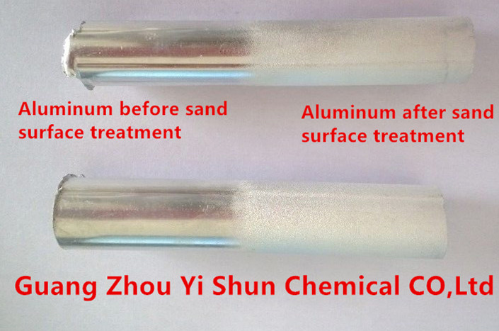 Chemical sand surface agent for aluminum,Aluminum dummy agent,Aluminum soft light treatment liquid Chemical sand surface agent for aluminum,Aluminum dummy agent,Aluminum soft light treatment liquid First, the product code: Q / YS.214 (Yi Shun brand) Second, product features: This product is suitable for aluminum alloy and die-casting aluminum sand surface treatment, the aluminum surface to form a uniform and beautiful sand surface effect. As long as the aluminum soaked in the sand agent in about 10 ~ 20 seconds, you can form a sand surface. Third, product index: ① Appearance: yellow-green transparent liquid, a slight odor; ② proportion:> 1.0 ③ PH value: <5.0 Fourth, product use method: ① sand agent stock solution use, soak the aluminum at room temperature 10 ~ 20 seconds, remove the aluminum workpiece, immediately washed. ② sand surface after treatment of the aluminum surface is not beautiful, but also on the polishing of aluminum polishes in 10 seconds and then washed immediately, so that the exposed aluminum surface of the sand. (Aluminum polishing agent product code is Q / YS. 204). ③ sand surface treatment process: aluminum degreasing、 washing、 sand surface agent 、washing 、polishing agent to polish (Q / YS.204) Die-casting aluminum degreasing、washing、sand surface agent、washing、 polishing agent to polish (Q / YS.204) 、whitener agent to wash (Q / YS.206). Other processing:Aluminum surface treatment agent series、Aluminum Antique Agent、Cast Aluminum Cleaning Agent、Environmental protection chemical plating nickel liquid (super-concentrated)、Gold colorant of aluminum