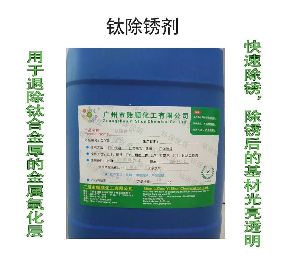 一、產(chǎn)品編號(hào):Q/YS.452(貽順牌) 二、產(chǎn)品簡(jiǎn)介: 該產(chǎn)品主要應(yīng)用于退除鈦合金厚的金屬氧化層。本除銹劑能快速除銹,除銹后的基材無(wú)斑點(diǎn)、光亮透明,是適用于手工除銹和機(jī)械除銹的高效除銹劑。 三、產(chǎn)品特點(diǎn): ① 酸性除銹劑,環(huán)保安全無(wú)毒,通過(guò)ROHS環(huán)保檢測(cè); ② 除銹速度快、徹底、無(wú)殘留,有效降低廢品率; ③ 安全穩(wěn)定、對(duì)基材無(wú)傷害。處理后的產(chǎn)品無(wú)斑點(diǎn)、光亮; ④ 常溫使用,操作方便。 四、 技術(shù)指標(biāo): ① 外觀:透明液體 ② 水溶性:完全水溶 ③ 氣味:無(wú)氣味 ④ 固含量:≥60% ⑤ 水溶性密度:1.1(g/cmЗ) ⑥ 閃點(diǎn):無(wú) ⑦ 可燃性:不可燃. ⑧ 除銹面積:≥20㎡/ kg 五、使用方法: 1、本產(chǎn)品為原液使用先用耐腐蝕塑料容器裝好,常溫使用。 2、本品在使用過(guò)程中,應(yīng)根據(jù)除銹產(chǎn)品的數(shù)量、班次來(lái)進(jìn)行不斷添加。 3、當(dāng)除銹效果不好時(shí),重新進(jìn)行徹底的更換以便清除沉淀物達(dá)到最佳效果。 4、原液使用,不要加水。 5、工件要完全浸沒(méi)在除銹劑中,并翻動(dòng)工件,不能使工件露出液面。 其他處理:鈦合金拋光劑、鈦合金亞光灰色劑、退鈦水、其他金屬處理系列等等