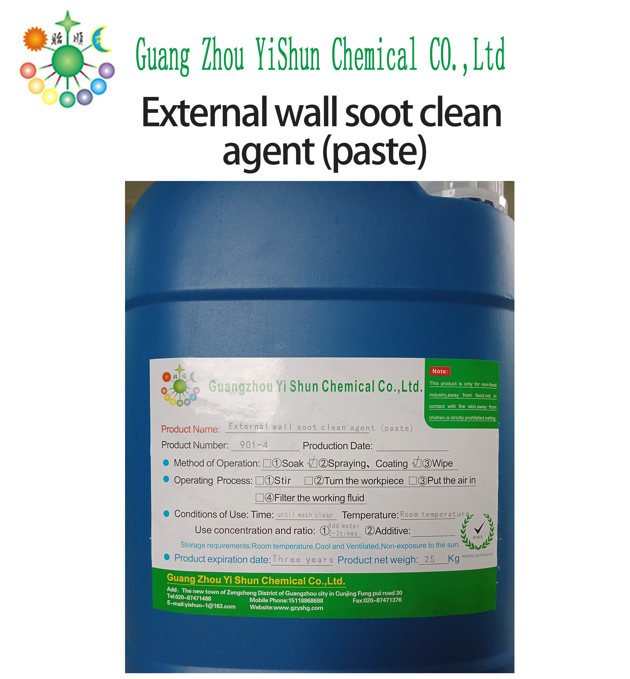 Exterior wall soot cleaner (paste), exhaust fan fume cleaner, cooking range fume cleaner, exterior wall environmental cleaner, exterior wall polish, exterior wall cleaner, exterior wall weathering dirt cleaner, exterior wall tile rust cleaner Exterior wall soot cleaner (paste), exhaust fan fume cleaner, cooking range fume cleaner, exterior wall environmental cleaner, exterior wall tile rust cleaner product number: Q/YS.901-4 (yishun brand) Application: This product is very suitable for all kinds of exterior wall oil, soot, smoke powder rapid cleaning treatment, after the brush treatment, remove all stubborn exterior wall surface dirt, oil mixture, make the wall take on a new look. It is also very suitable for the surface cleaning of exhaust fan, cooking range, etc. Product indicators (1)This product is paste. (2) specific gravity >1.0. (3) PH > 7.0. Usage: 1. Put on rubber gloves, add 2-3 times of the external wall soot cleaner into the tap water, and mix it evenly to form the cleaning solution. 2. Stick the cleaning liquid with a plastic brush and scrub it back and forth. 3. Wash the wall with water to make the wall take on a new look. matters needing attention: (1)This product cannot contact with skin and eyes. (2) use this product, to wear rubber gloves. Other processing:Multifunctional disinfection detergent、Industrial cleaning agent、Gold and silver jewelry bright cleaning agent、Metal cleaning agent、Environmental degreer and rust remover、Stainless Steel Polishing Agentas