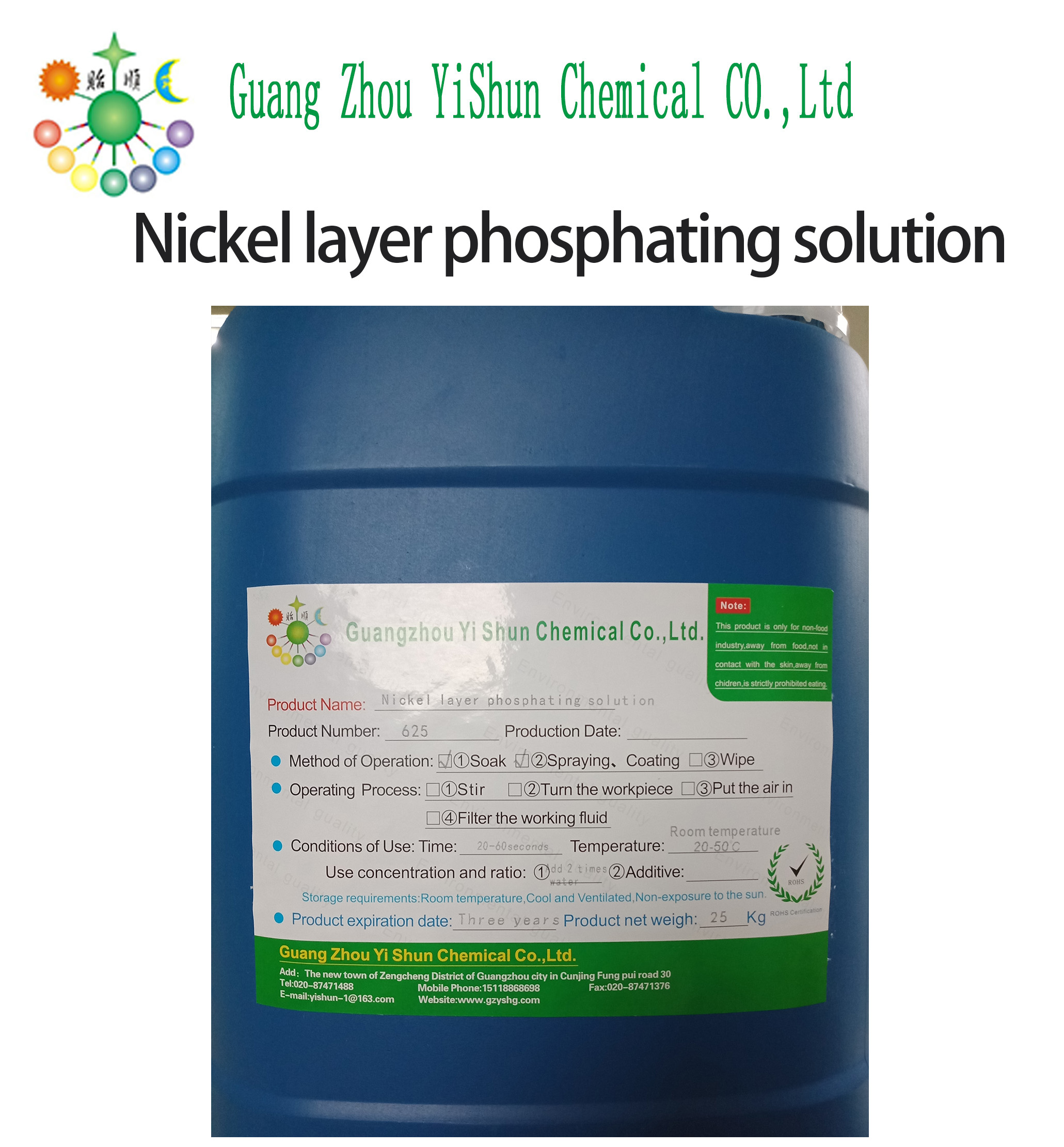 Nickel layer phosphating solution, nickel layer pre-painting phosphating treatment, nickel layer rustproof phosphating agent, environmental protection nickel layer phosphating agent, room temperature nickel phosphating treating agent, metal phosphating solution, nickel phosphating rustproof solution Nickel layer phosphating solution, nickel layer pre-painting phosphating treatment, nickel layer rustproof phosphating agent, environmental protection nickel layer phosphating agent product number: Q/YS.625 (yishun brand) Product scope and features This product is used for the phosphating treatment of nickel surface, saving labor and cost. After the treatment of this product, a dense gray black phosphating film is formed on the surface of nickel. After the treatment of this product, the workpiece can be used for the bottom layer of various paints and electrophoretic paints, and the adhesion of the paint can be improved. The product does not contain any heavy metals or toxic substances. Product indicators 1. Appearance: transparent, light yellow (no heavy metal, no chromium) 2. Acidic products. 3, using temperature: room temperature (20 ~ 50 ℃) Treatment: This product can be used twice with water. After soaking for 20 ~ 60 seconds, the workpiece is taken out and washed with water. Finally, the workpiece can be dried naturally. Other processing:Stainless Steel blackening agent at ambient temperature、Environmental overspeed deplating agent(copper,tin,lead)、Tin stripping liquid(Iron base material)、Colorful passivation agent of zinc without chrome、Steel passivation Agent