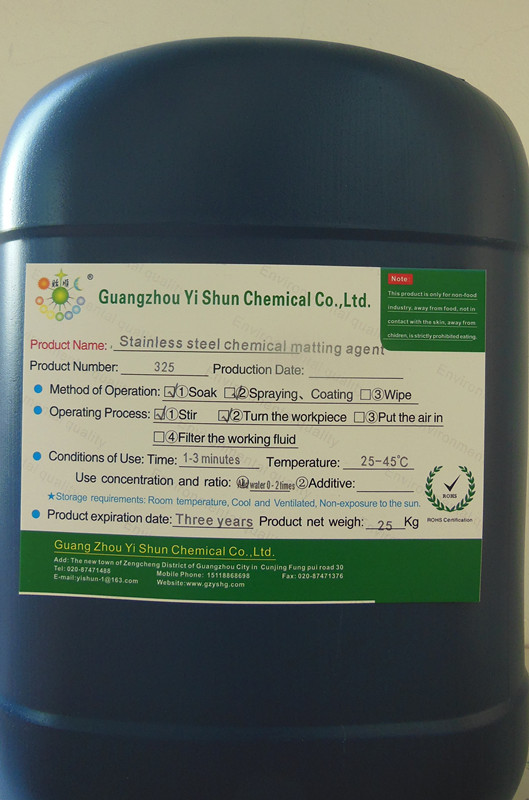 Stainless steel chemical matte agent,Metal Matte Liquid,Steel Soft Light Treatment Stainless steel chemical matte agent,Metal Matte Liquid,Steel Soft Light Treatment First, the product code: Q / YS.325 (Yi Shun brand) Second, the product uses: This product is suitable for 2 # word, 3 # word, 4 # series of stainless steel matte treatment, stainless steel materials to get a uniform matte surface. Easy to operate, just soak in matting agent for 1-3 minutes. Widely used in 201 #, 301 #, 304 #, 316 # matting treatment. Third, product index: 1, mahogany color liquid, a small amount of smell; 2, PH value <7, acidic products; 3, the proportion of> 1.0. Fourth, the use of methods: 1, this product is used at 25 ℃ -45 ℃, can be used 0-2 times watered; 2, the degreasing stainless steel soaked in stainless steel chemical matting agent, about 1-3 minutes, remove the stainless steel can be washed. 3, matte treatment of other treatment: such as passivation, electroplating, chemical plating and so on. Fifth, note: 1, this product is acidic, not in contact with the skin. 2, the best temperature matting agent is 35 ℃. Other processing:Steel imitation gold liquid、Environmental degreer and rust remover、Brass Green Chemical polishing Agent、Strong oil stain removal agent、stainless steel whitening agent、Stainless Steel Polishing Agentas