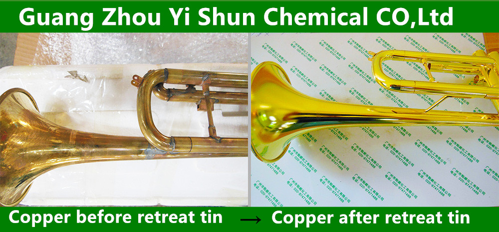 Tin-off treatment: After the tin body surface copper substrate there will be a layer of gray film, with the removal of the film to remove the film preparation method is as follows: 1 kg of water by adding 100 ~ 200 grams of A and 100 ~ 200 grams of B, after mixing use. The agent is only used in addition to film, remove the film after the copper matrix exposed. Remove the workpiece water rinse.