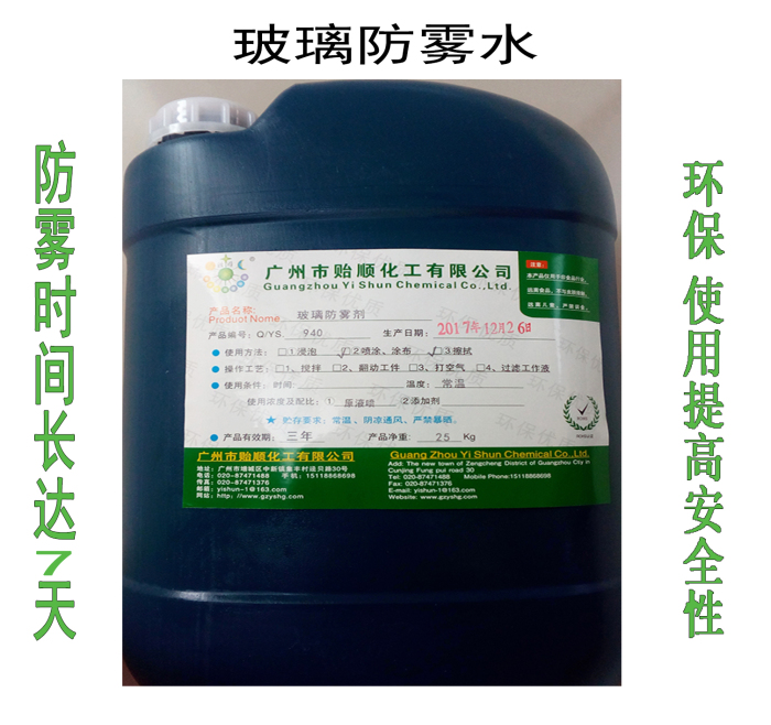 玻璃長效防霧劑(環(huán)保天然型) 一、產品編號:Q/YS.940(貽順牌) 環(huán)保防霧水 天然型防霧劑 擋風玻璃防霧 眼鏡鏡片噴霧防霧 二、產品適用范圍: 本產品可以防止擋風玻璃,鏡片產生霧,避免視線的影響,提高安全性,本產品環(huán)保,對人及環(huán)境無霧,防霧時間長達7天。 三、產品指標:1.透明有香味液體。 2.中性,比重>1.0 四、使用方法:對準玻璃進行噴霧,或者用干凈的毛巾粘取本劑在玻璃表面擦拭。自然干燥后,即可達到防霧的效果。
