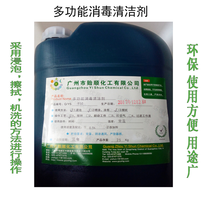 多功能消毒清潔劑 一、產(chǎn)品編號(hào):Q/YS.950(貽順牌) 滅菌劑 清洗消毒二合一 堿性消毒清潔劑 二、產(chǎn)品適用范圍: 本產(chǎn)品是環(huán)保產(chǎn)品,廣泛用于地板,墻面,衛(wèi)生間,馬桶,廚房,廚具,酒店衣服,床單等的消毒,除油,除污漬,除血漬,除斑。使用方便,可采用浸泡,擦拭,機(jī)洗的方法進(jìn)行操作,具有:消毒除臭,清洗,漂白(不傷纖維)殺菌等多重功效。適用于酒店,醫(yī)院,公共場(chǎng)所等。 三、產(chǎn)品指標(biāo):本產(chǎn)品為固體無(wú)異味,無(wú)不適應(yīng)氣味。 四、使用方法:在自來(lái)水中加入本劑1%-2%后,溶解完全再使用,可采用擦拭,浸泡及機(jī)洗的方法進(jìn)行。