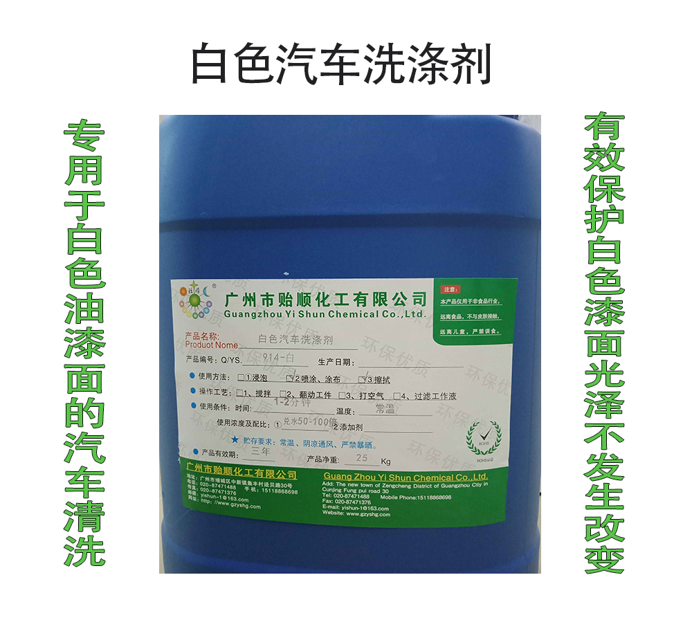 一、產(chǎn)品編號(hào):Q/YS.914-白(貽順牌) 二、產(chǎn)品用途: 本產(chǎn)品由天然材料科學(xué)研制而成,專用于白色油漆面的汽車清洗。泡沫豐富,清洗力很強(qiáng),不傷人的皮膚及油漆面。長(zhǎng)期使用本產(chǎn)品,可以有效保護(hù)白色漆面光澤不發(fā)生改變,本產(chǎn)品對(duì)人體和環(huán)境安全友好。 三、 產(chǎn)品指標(biāo): ① 外觀:粘稠,透明,有香味的液體。 ② PH:7.0,中性液體 四、使用方法: 1、兌水50-100倍后,攪拌均勻,噴到車表面,停留1-2分鐘,再?zèng)_洗或用絨布擦拭。