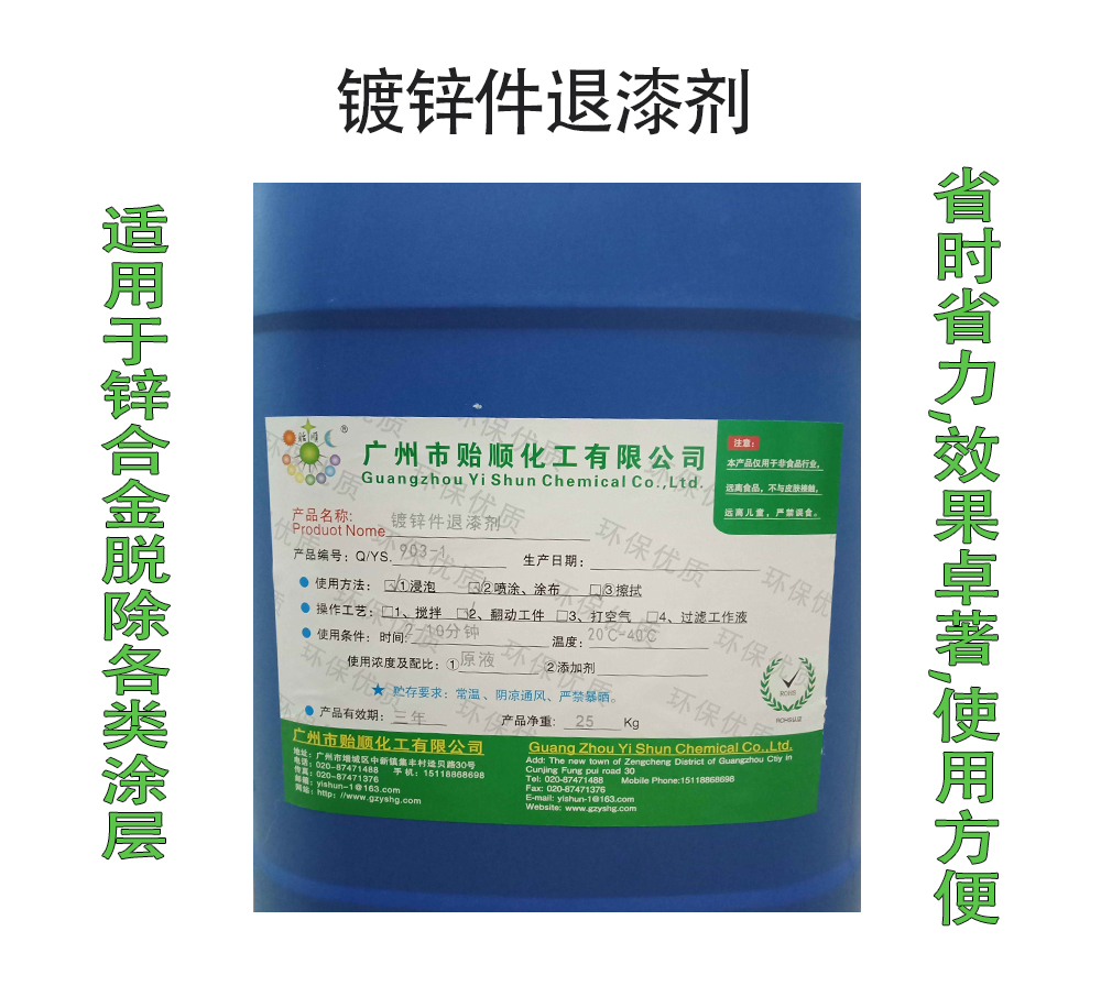 鍍鋅件退漆劑 快速退漆劑 鋅材去漆劑 環(huán)保型鋅脫漆劑 鍍鋅件除漆劑 溶解性脫漆劑 鍍鋅件脫漆劑 二、產(chǎn)品介紹: 本產(chǎn)品適用于鋅合金脫除各類電泳漆、烤漆、噴塑等涂層,省時省力,效果卓著,使用方便,不燃不爆,環(huán)保,無毒無氣味。 三、使用范圍: ① 汽車、火車、輪船、集裝箱、摩托車、農(nóng)用機(jī)械、石油化工機(jī)械設(shè)備漆膜的脫除。 ② 廢品噴涂物的重新涂裝、更新、大修等。 ③ 粉末涂料加工廠,噴漆室和烘道內(nèi)模具的清洗 四、使用方法:請先小拭。 ① 本品使用溫度20-40℃,不用稀釋,原液使用,嚴(yán)禁摻水。產(chǎn)品有腐蝕性,帶頭帽和乳膠手套操作。輕拿放,防飛濺。 ② 在攪拌脫漆劑的同時,緩緩呈細(xì)流狀將脫漆加速劑注入 脫漆劑中。每公斤脫漆劑加入加速劑20克~30克。 ③ 對小型工件、形狀復(fù)雜的工件及電機(jī)修理中的廢漆包線,可以采用浸泡法。浸入脫漆劑中,2—10分鐘內(nèi)即可露出光亮基底; 對需脫漆的車身及大型零部件可將其擲于脫漆槽中,以達(dá)到預(yù)定的效果。 ④ 對于較大且不易移動的工件可采用涂抹法脫漆。 五、注意事項: ② 本產(chǎn)品對皮膚有一定的腐蝕性,請戴手套操作。 其他處理:鋅無鉻無材鈍化劑、白鐵皮雪花斑生成劑(鍍鋅層)、其他鋅材處理、鋁五彩鈍化劑等等
